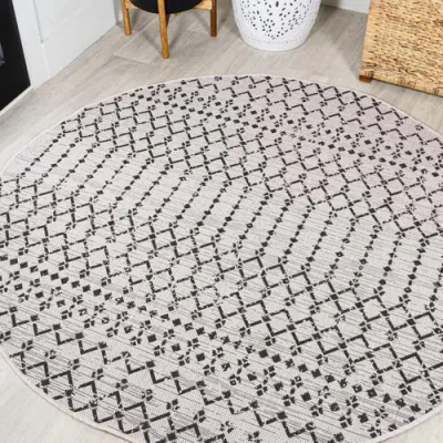 Ourika Moroccan Geometric Textured Weave Indoor/outdoor Round Area Rug In Cream/black