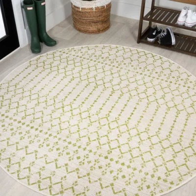 Ourika Moroccan Geometric Textured Weave Indoor/outdoor Round Area Rug In Cream/green