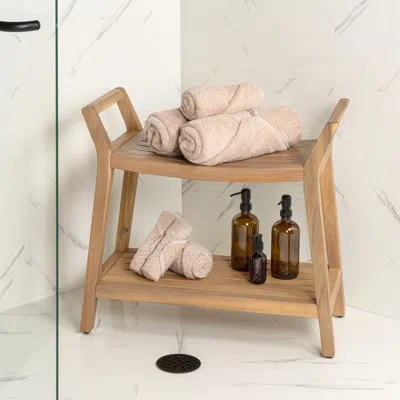 Orla 25.6" Modern Classic Slatted Solid Acacia Wood Indoor/outdoor Shower Bench With Shelf And Handl In Neutral