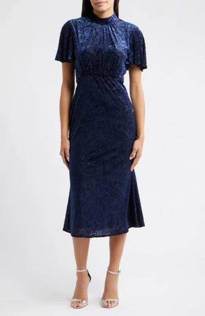 Velvet Burnout Short Sleeve Midi Dress In Blue