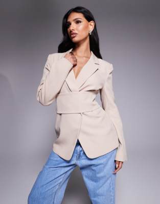 Exclusive Cinched Waist Belted Tie Back Blazer In Gray