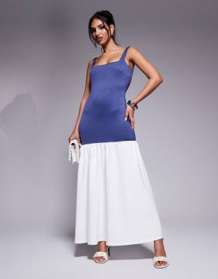 Exclusive Square Neck Contrast Drop Waist Maxi Dress In Dark Blue And Cream