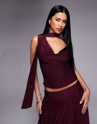 Exclusive Double Layered Slinky Cowl Neck Scarf Detail Top In Burgundy