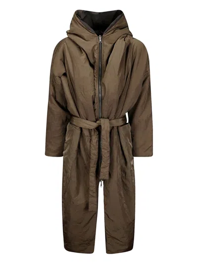 Long Padded Jacket With Front Zip And Removable Belt In Brown