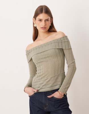Off The Shoulder Long Sleeve Fine Knit Top In Green