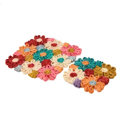 Pink / Yellow Pahiyas Woven Raffia Fringe Coasters Multi, Set Of 4