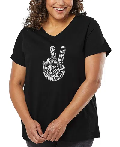 Plus Size Peace Finger Notes Word Art V-neck T-shirt In Black