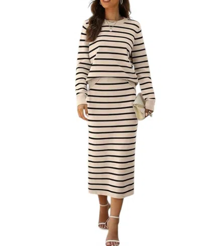 Stripe Ribbed Trim Top & Midi Skirt Set In Black In Neutral