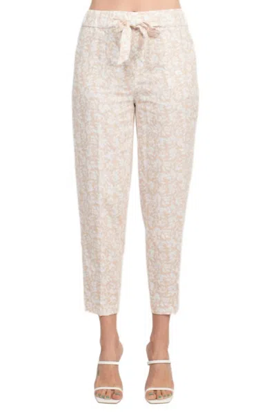 Women's Elastic Waist Tie Waist Multi Print Slit Hem Linen Pant In Tan Floral