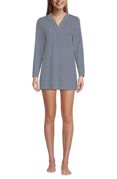 Cotton Jersey Long Sleeve Hooded Swim Cover-up Dress In Deep Sea Navy Mini Stripe