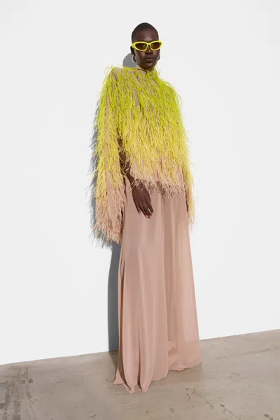 Lightweight Jersey Deep Cowl Neck Gown With Feathers In Brown