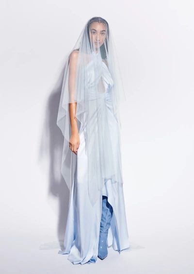 Satin Oversized Cape Dress With Feathers In Washed Silver
