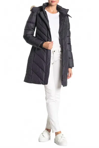 Mid Length Faux Fur Hooded Puffer Jacket In Grey In Gray