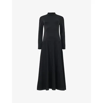 Womens Textured-sleeve High-neck Stretch Cotton-blend Midi Dresss In Black