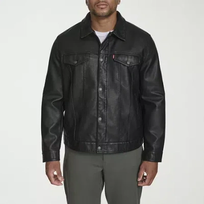 's Mens Faux Leather Midweight Trucker Jacket In Black