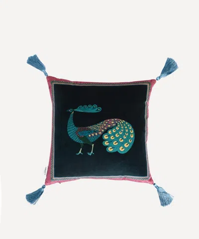 Peacock Garden Velvet Cushion In Blue