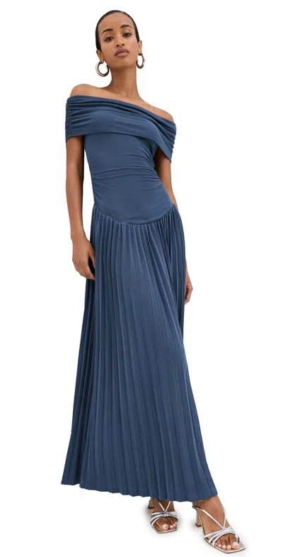 Field Of Dreams Fine Knit Foldover Bardot Ruched Drop Waist Pleated Maxi Dress In Soft Blue