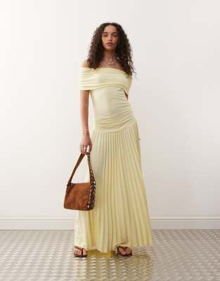 Field Of Dreams Foldover Bardot Ruched Drop Waist Pleated Maxi Dress In Yellow