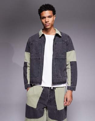 Relaxed Zip Denim Biker Panel Jacket In Multi