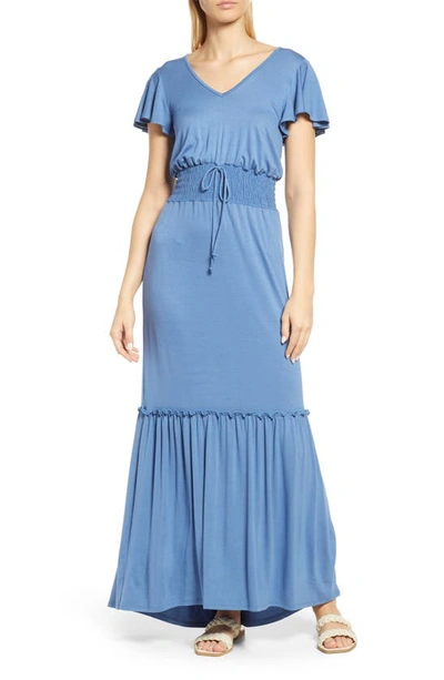 Ruched Sleeve Empire Waist Maxi Dress In Blue
