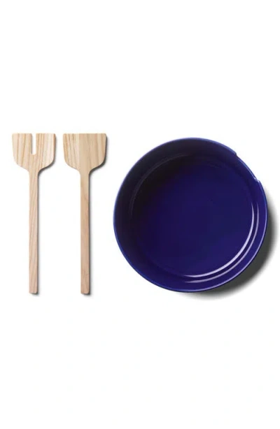 Collective Salad Glass Bowl With Wooden Servers In Blue