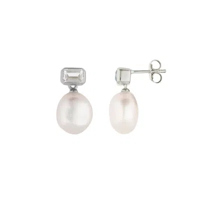 Women's Pearl Drop Stud Silver Earrings With Baguette Cubic Zirconia