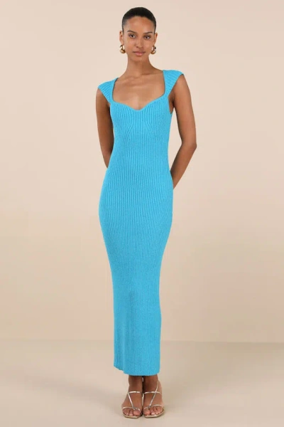 Chiara Turquoise Ribbed Knit Cap Sleeve Midi Dress In Blue