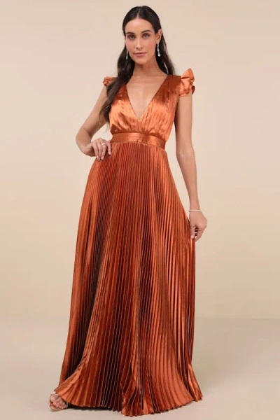 Exceptional Drama Rust Orange Satin Lace-up Pleated Maxi Dress