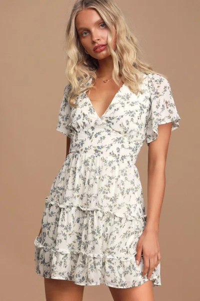 So True White Floral Print Tiered Short Sleeve Mini Dress