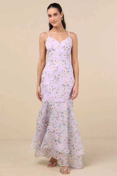 Pure Splendor Lavender Floral Organza Trumpet Maxi Dress In Purple