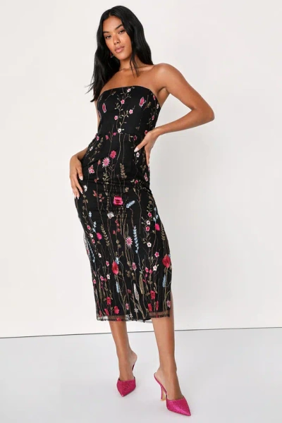 Bold Botanicals Black Floral Embroidered Strapless Midi Dress