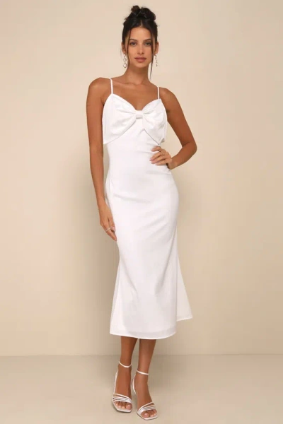 Extravagantly Sleek White Satin Sleeveless Bow Midi Dress