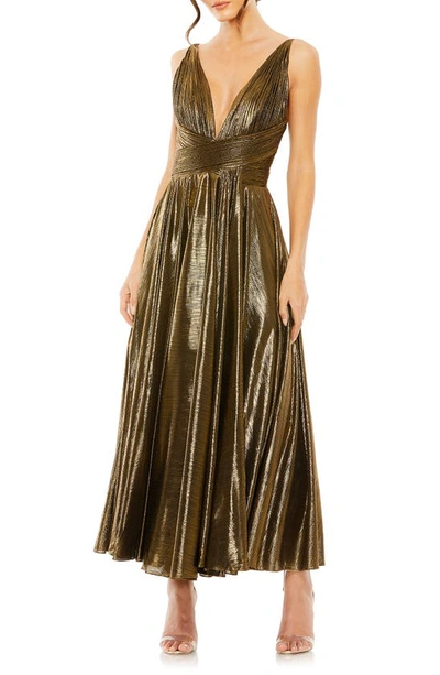 30761 Pleated Metallic Formal Tea Length Prom Dress In Blue