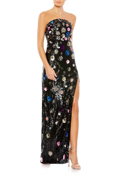 Floral Sequined Strapless Column Gown In Black Multi