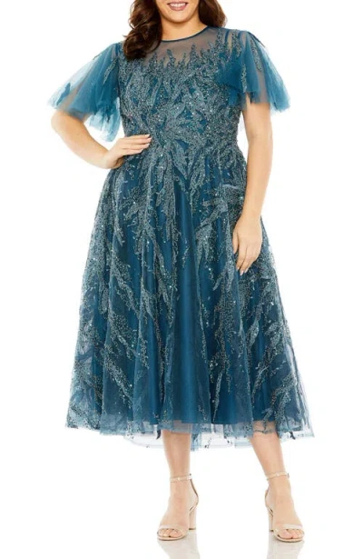 High Neck Flutter Sleeve A Line Embellished Dress In Blue