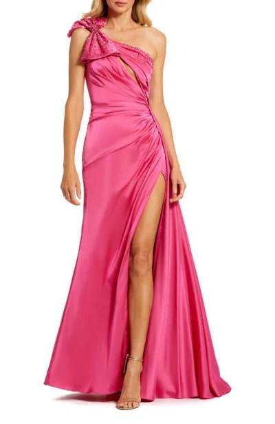 One Shoulder Embellished Bow Satin Gown In Pink