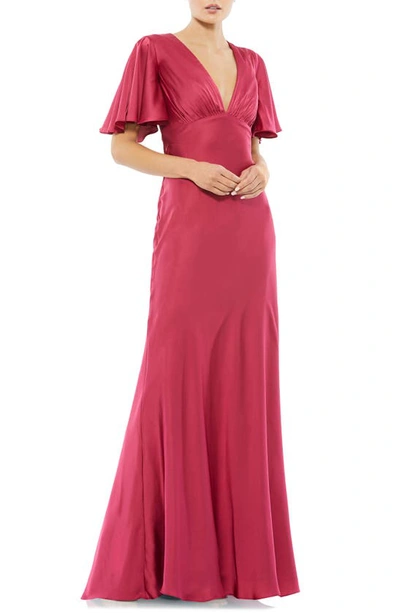 Flounce Sleeve Satin Trumpet Gown In Raspberry