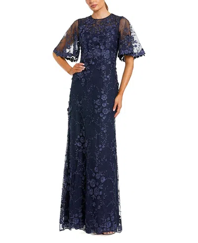 Flutter Sleeve Floral Emboridered Net Gown In Blue