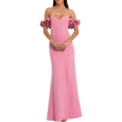 Off-the-shoulder Crepe Gown With 3d Floral Applique In Pink