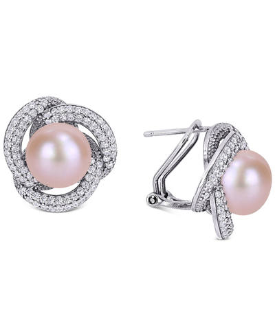 Pink Cultured Freshwater Pearl (10-1/2mm) & Cubic Zirconia Love Knot Stud Earrings In Sterling Silve In Silver