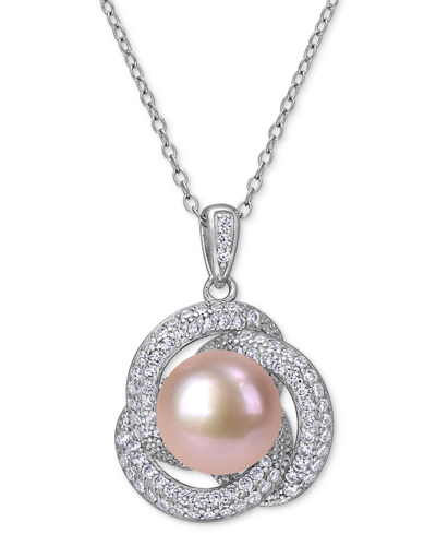 Pink Cultured Freshwater Pearl (10-1/2mm) & Cubic Zirconia Love Knot 18" Pendant Necklace In Sterlin In Silver