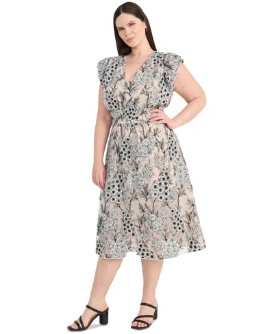 Plus Size Chiffon Embroidered Ruffled-sleeve Dress In Gray