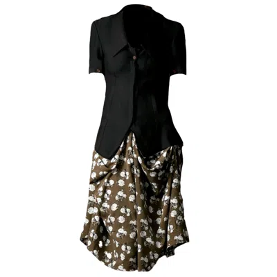 Women's White / Black / Brown Fitted Shirt-top Mid-calf Blossom Dress In White/black/brown