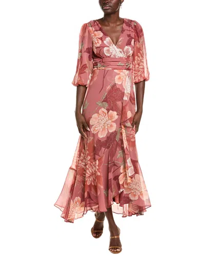 Multi Print Surplice Neck Faux Wrap Midi Dress In Black Blush