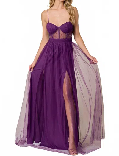 Sheer Embellished Tulle Two Slits Prom Dress In Eggplant In Purple