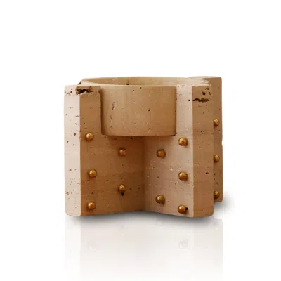 Neutrals Travertine & Brass Studded Vessel, Sculptural Design With Brass Stud Details