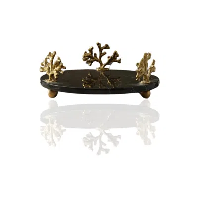Round Black Marble Tray With Gold Coral Accents