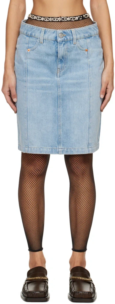 Blue Narrow Front Denim Miniskirt In Bleached Wash