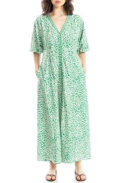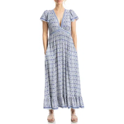 V-neck Flutter Sleeve Smocked Waist Maxi Dress In Multi