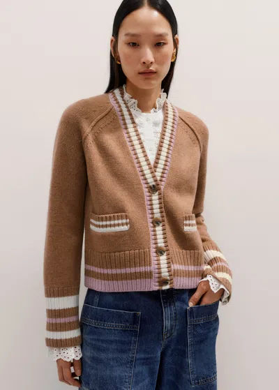 Merino Wool Varsity Cardigan In Camel Multi